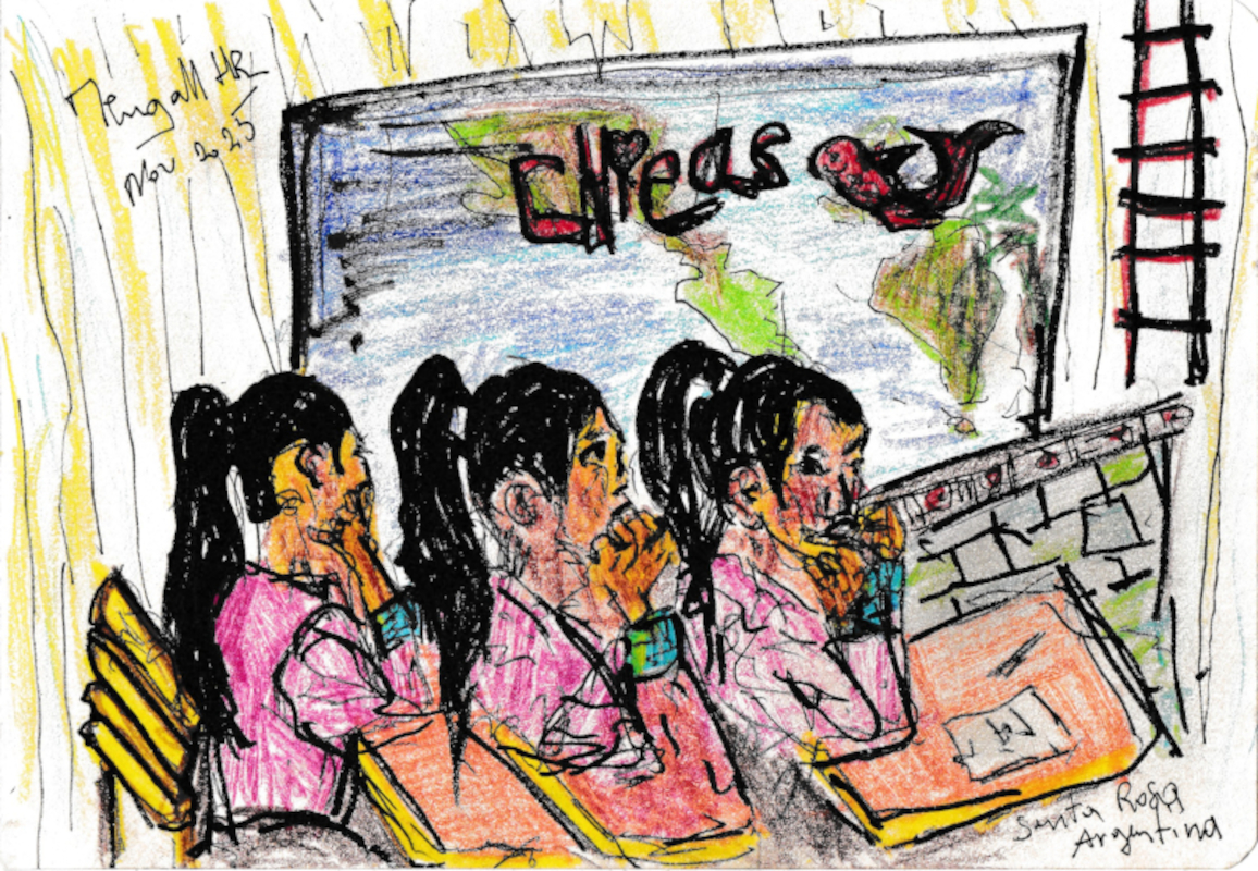 A cette occasion, Mengall HR a rencontré les élèves dans des petits villages perdus de la pampa et dessiné pendant tout le voyage.